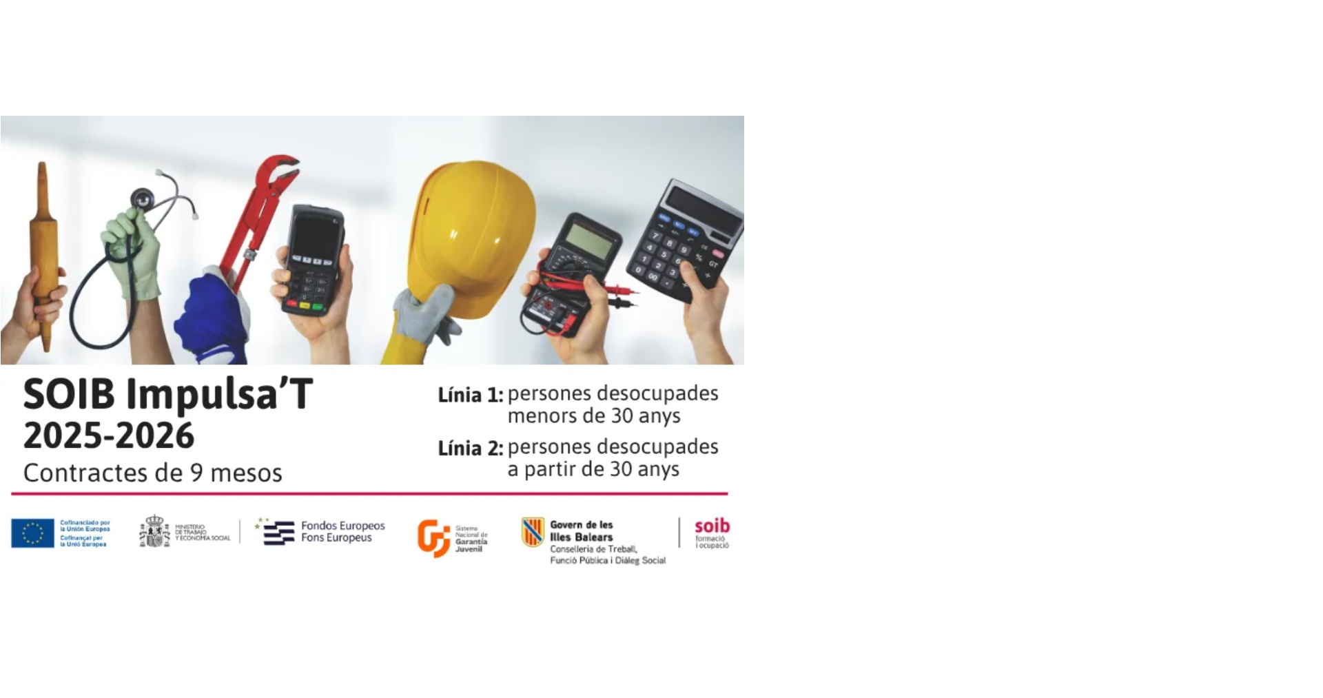 SOIB Impulsa’T 2025-2026 és un programa de contractació pública, destinat a finançar projectes que fomentin la contractació de persones joves desocupades (majors de 16 i menors de 30 anys) sense estudis superiors, i persones desocupades de 30 o més anys, preferentment en situació de desocupació de llarga durada, per tal que puguin adquirir experiència professional i mantenir les seves competències professionals, a fi de millorar-ne l’ocupabilitat i transitar cap a una inserció laboral continuada i de qualitat.
